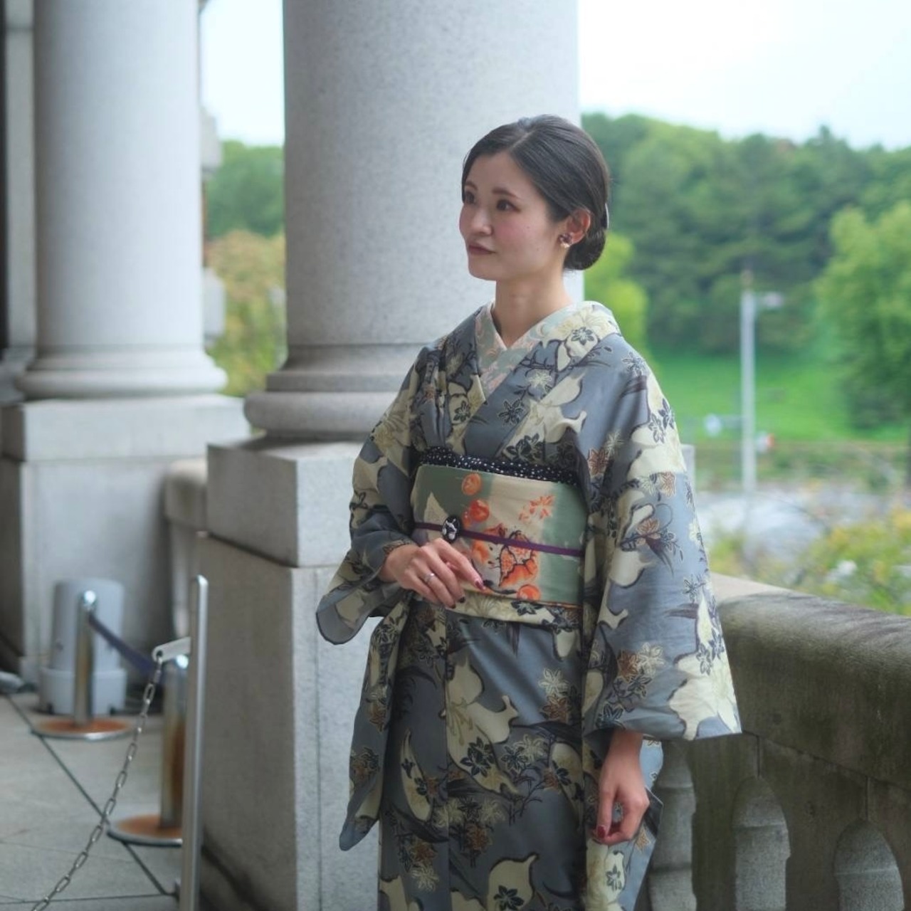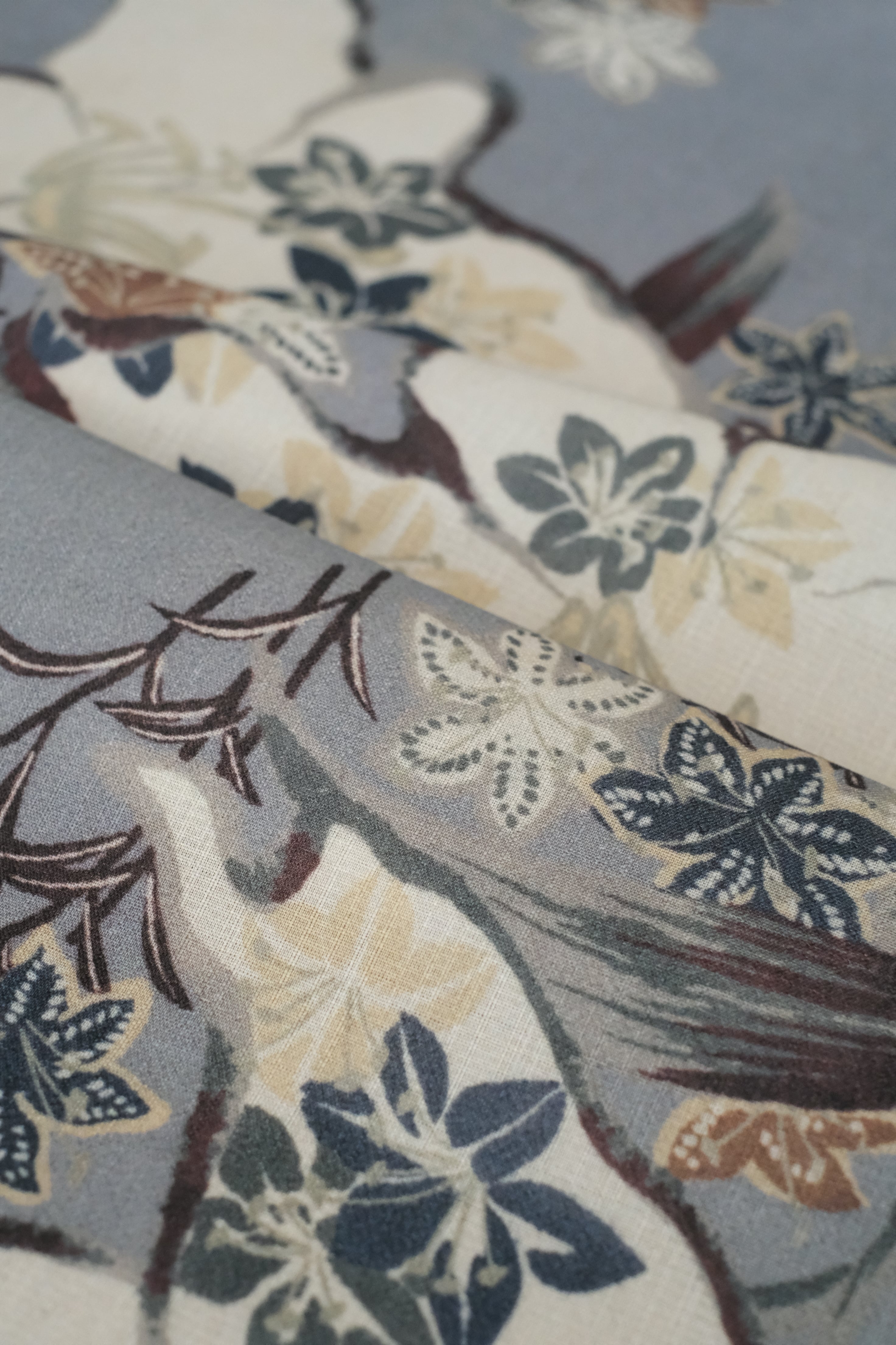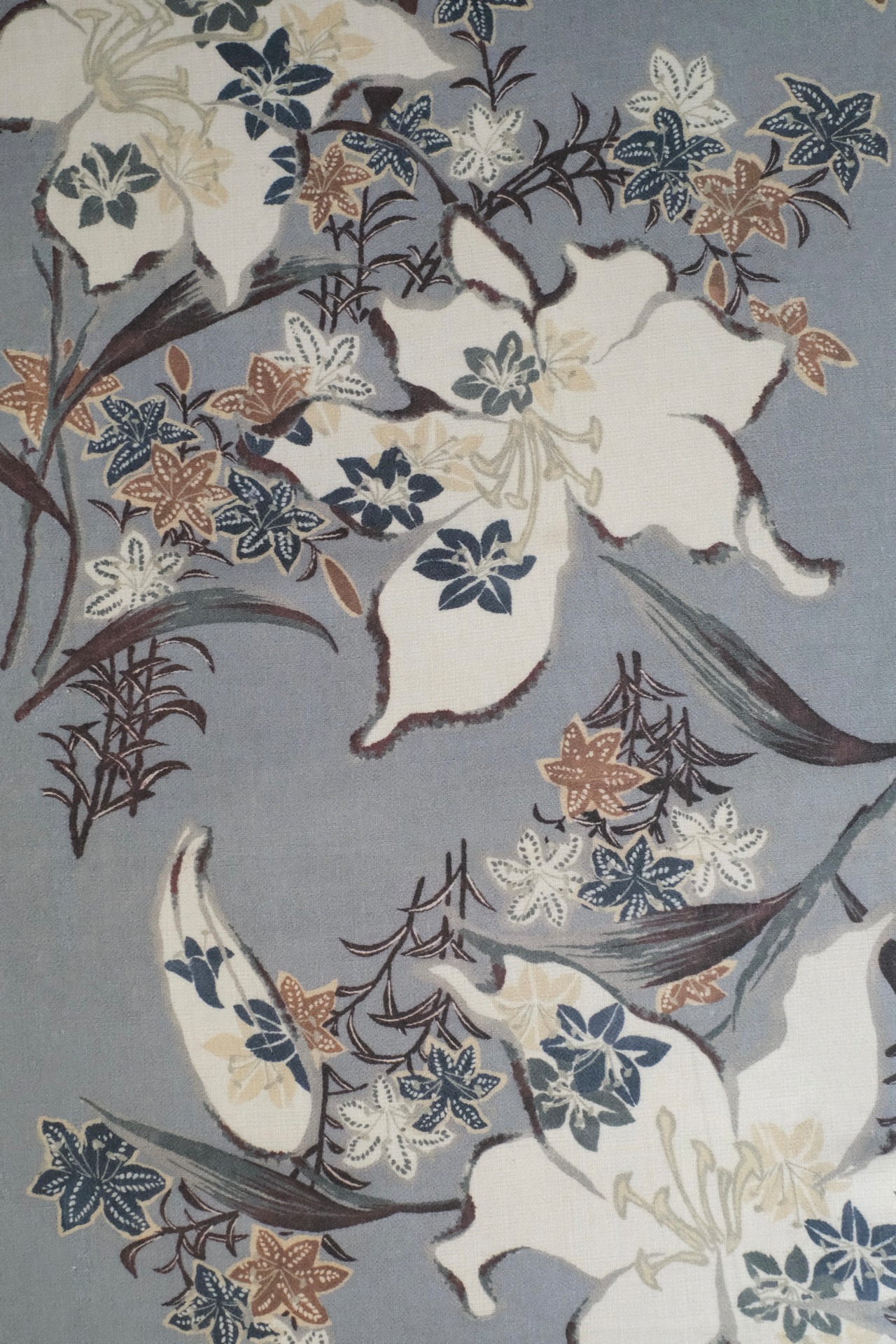 大人っぽいグレーの地にアンティークなお色の大きな百合が大胆に描かれており、その周りに小さな百合がたくさん咲いています。