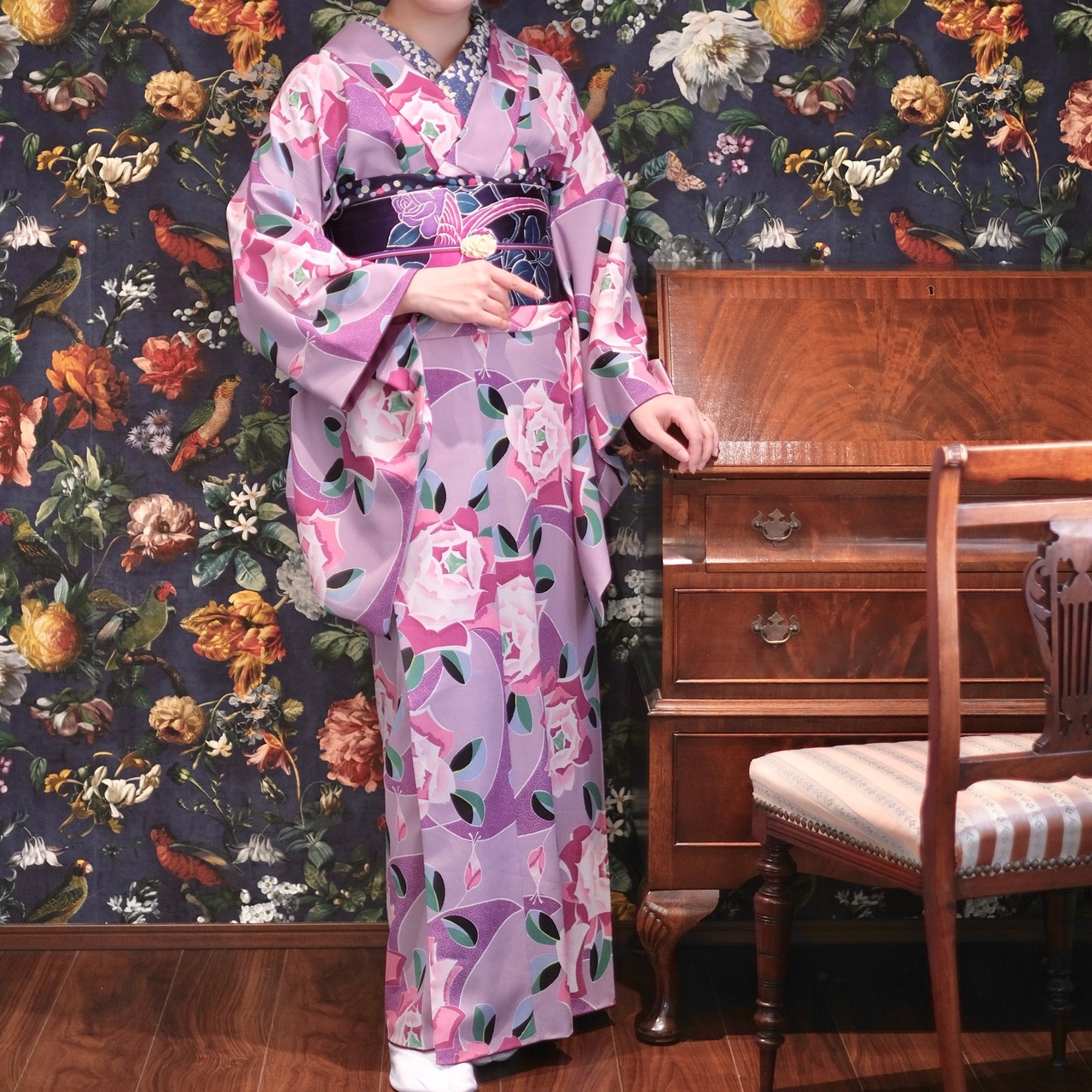 アール・デコな薔薇とくるくると可愛らしい模様の調和が美しい柄の反物です。