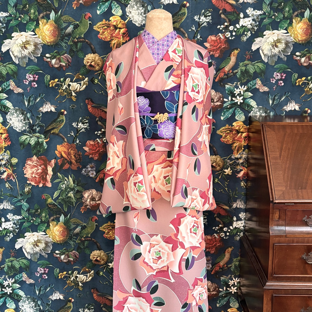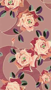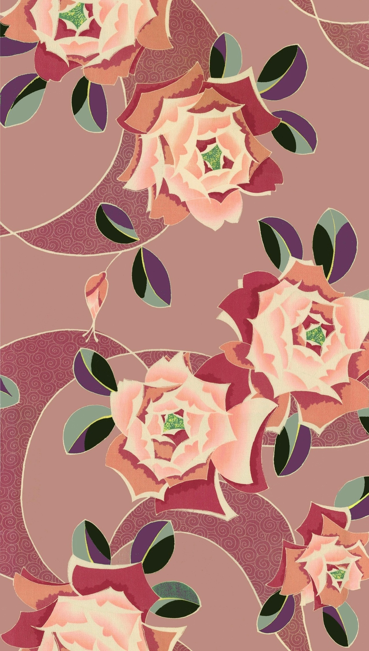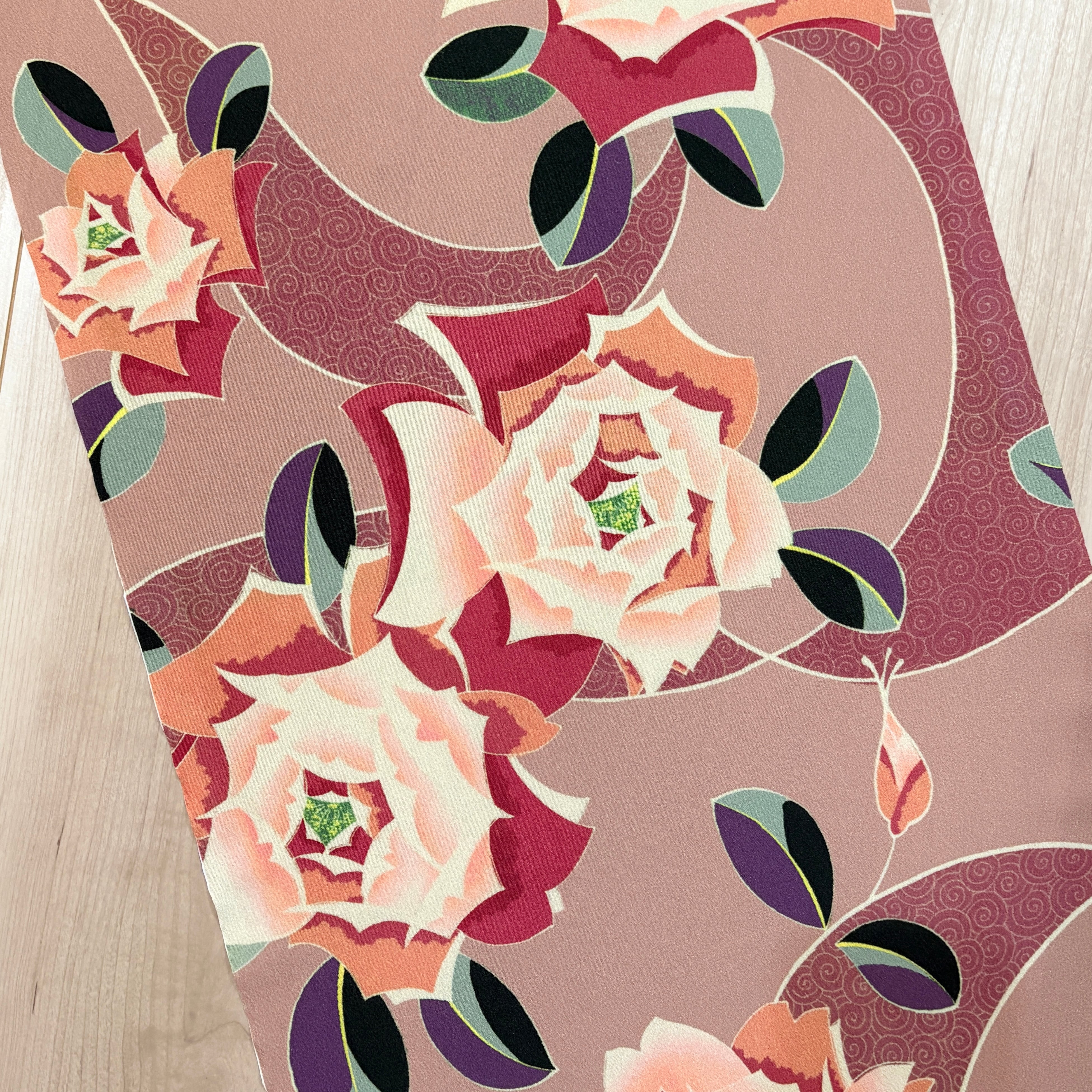 アール・デコな薔薇とくるくると可愛らしい模様の調和が美しい柄の反物です。