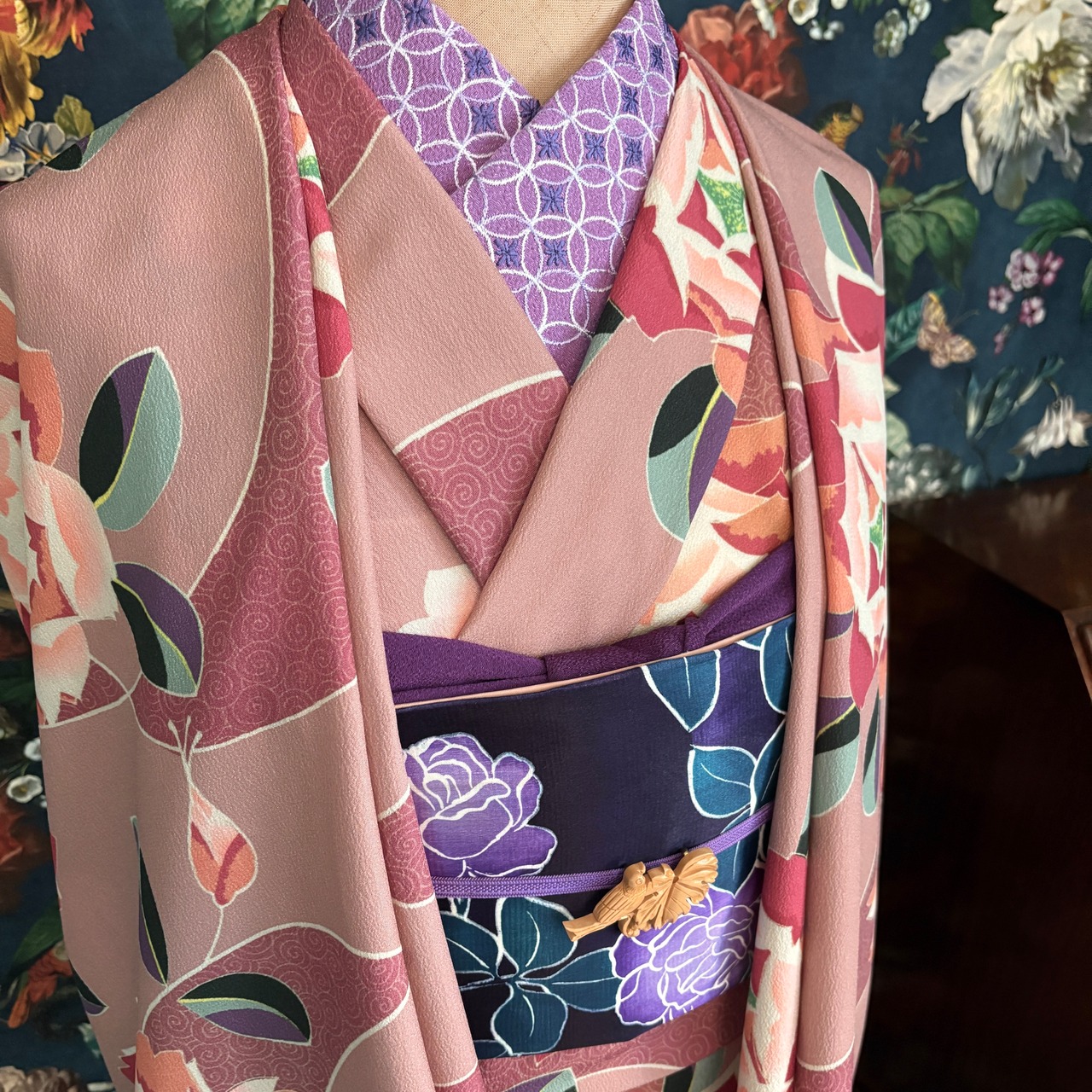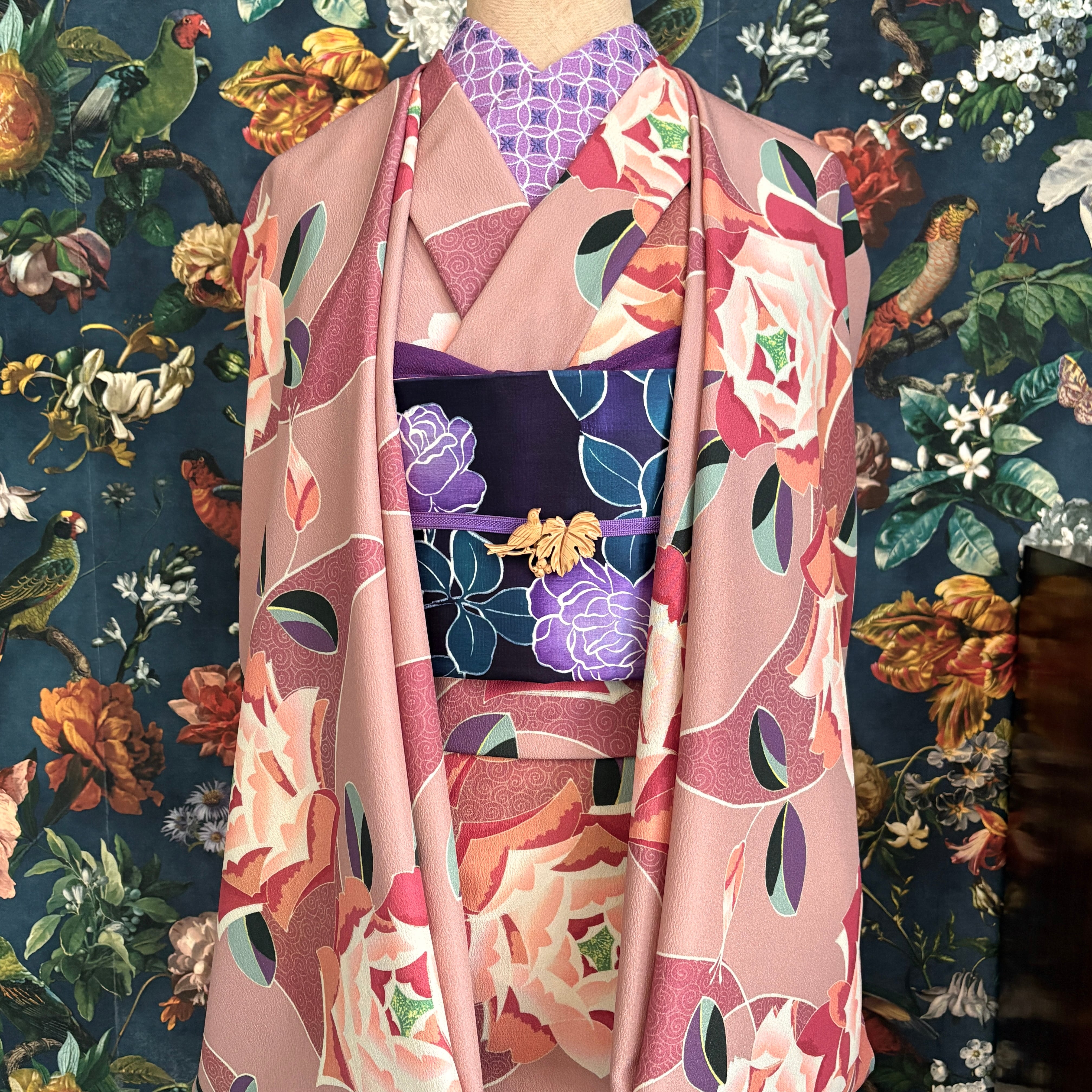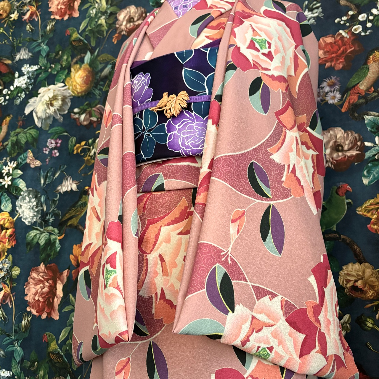 アール・デコな薔薇とくるくると可愛らしい模様の調和が美しい柄の反物です。